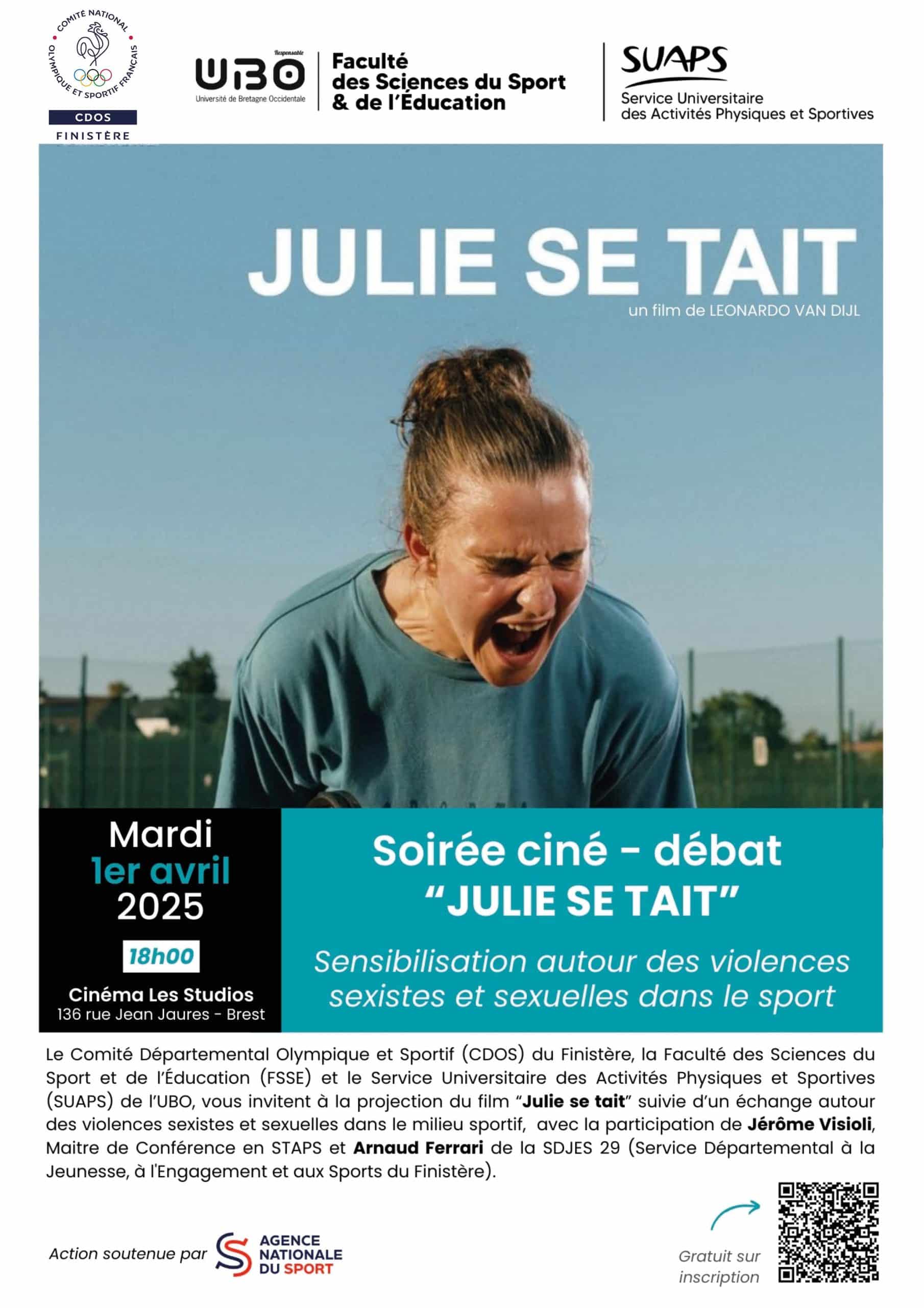 🧐 Le Comité Départemental Olympique et Sportif (CDOS) du Finistère, la Faculté des Sciences du Sport et de l’Éducation (FSSE BREST) et le Service Universitaire des Activités Physiques et Sportives (SUAPS) de l’UBO – UBO – Université de Bretagne Occidentale, vous proposent un ciné débat avec le film “Julie se tait” suivi d’un échange autour des violences sexistes et sexuelles dans le milieu sportif, avec la participation de Jérôme Visioli, Maitre de Conférence en STAPS et l’intervention de la SDJES Finistère sur la cellule Signal sport.