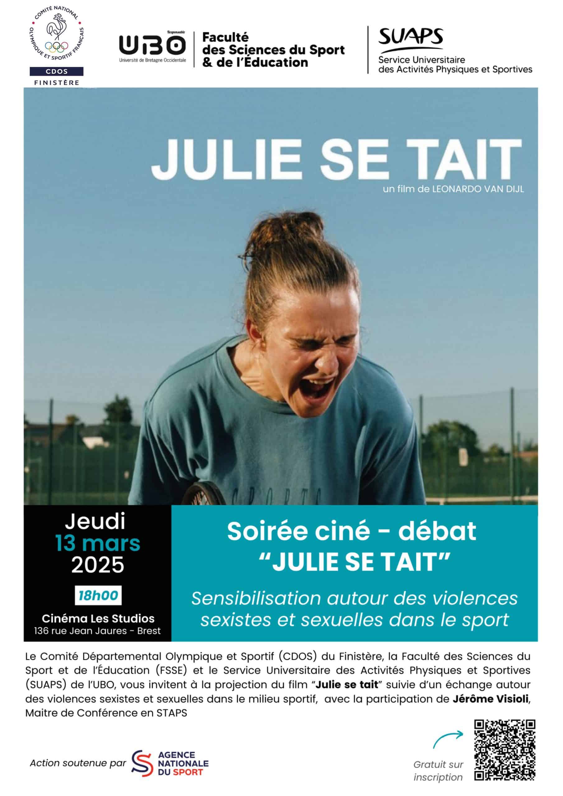 Le Comité Départemental Olympique et Sportif (CDOS) du Finistère, la Faculté des Sciences du Sport et de l’Éducation (FSSE) et le Service Universitaire des Activités Physiques et Sportives (SUAPS) de l’UBO, vous proposent un ciné débat avec le film “Julie se tait” suivi d’un échange autour des violences sexistes et sexuelles dans le milieu sportif, avec la participation de Jérôme Visioli, Maitre de Conférence en STAPS.